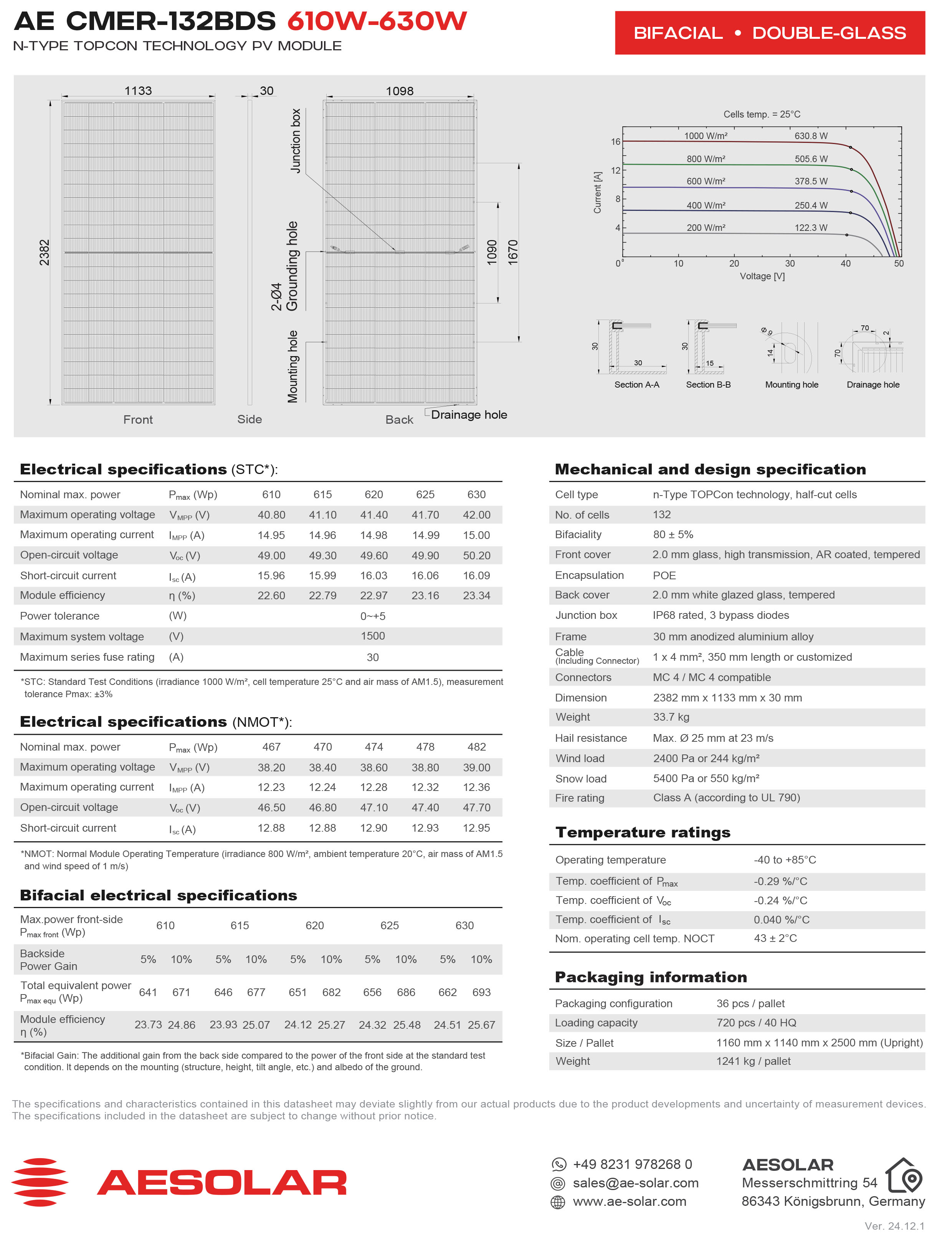 2. Thông số kỹ thuật của tấm pin AE Solar 610W Double Glass