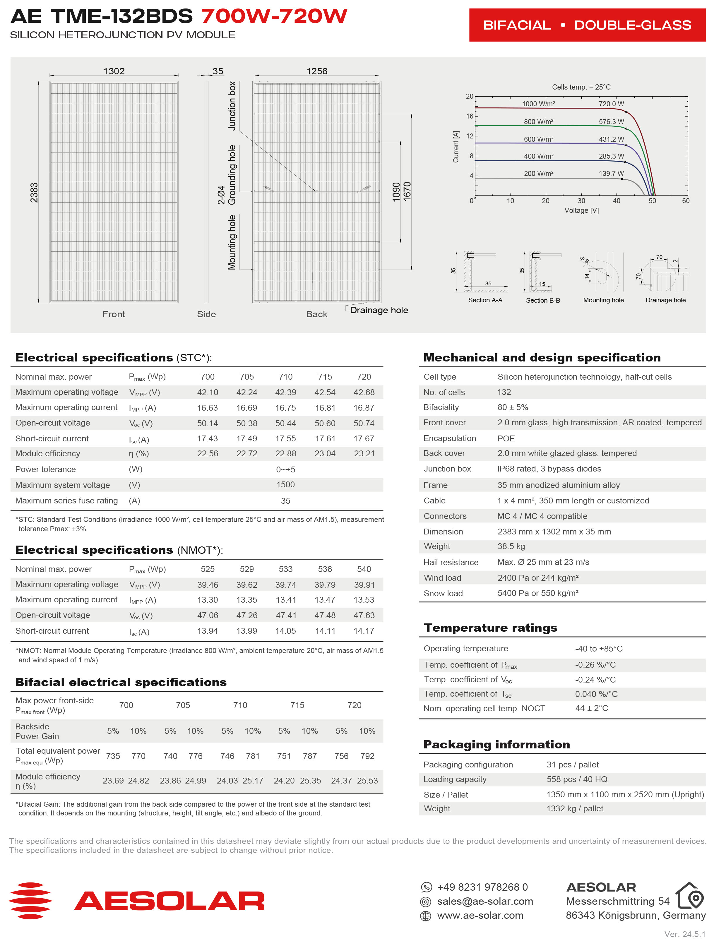 2. Thông số kỹ thuật của tấm pin AE Solar 700W (Double Glass Bifacial)